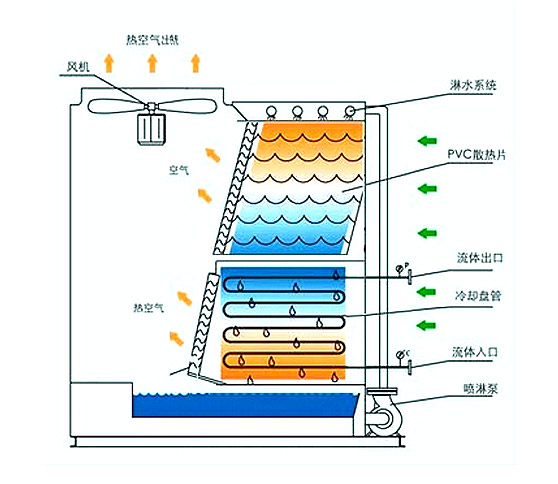 工作流體(純水或防凍液)在閉式冷卻塔的盤管中循環,工作流體熱量經過盤管散入流過盤管的水中同時機組外的空氣從機組側面上的進風格柵進入,與水的流動方向垂直,向上流經盤管一小部分水蒸發而吸走熱量,熱濕空氣由冷卻塔頂部的通風機排出到大氣中。其余的水落入底部水盤,由水泵再循環至水分布系統又回淋到盤管上。
